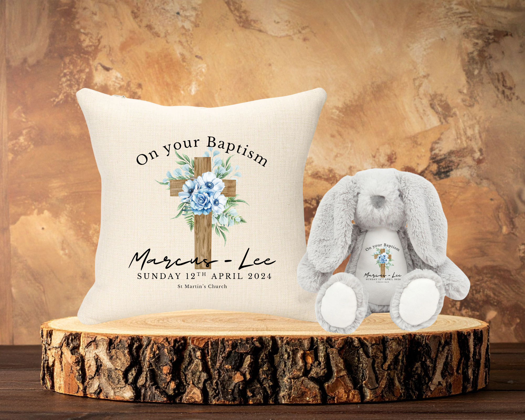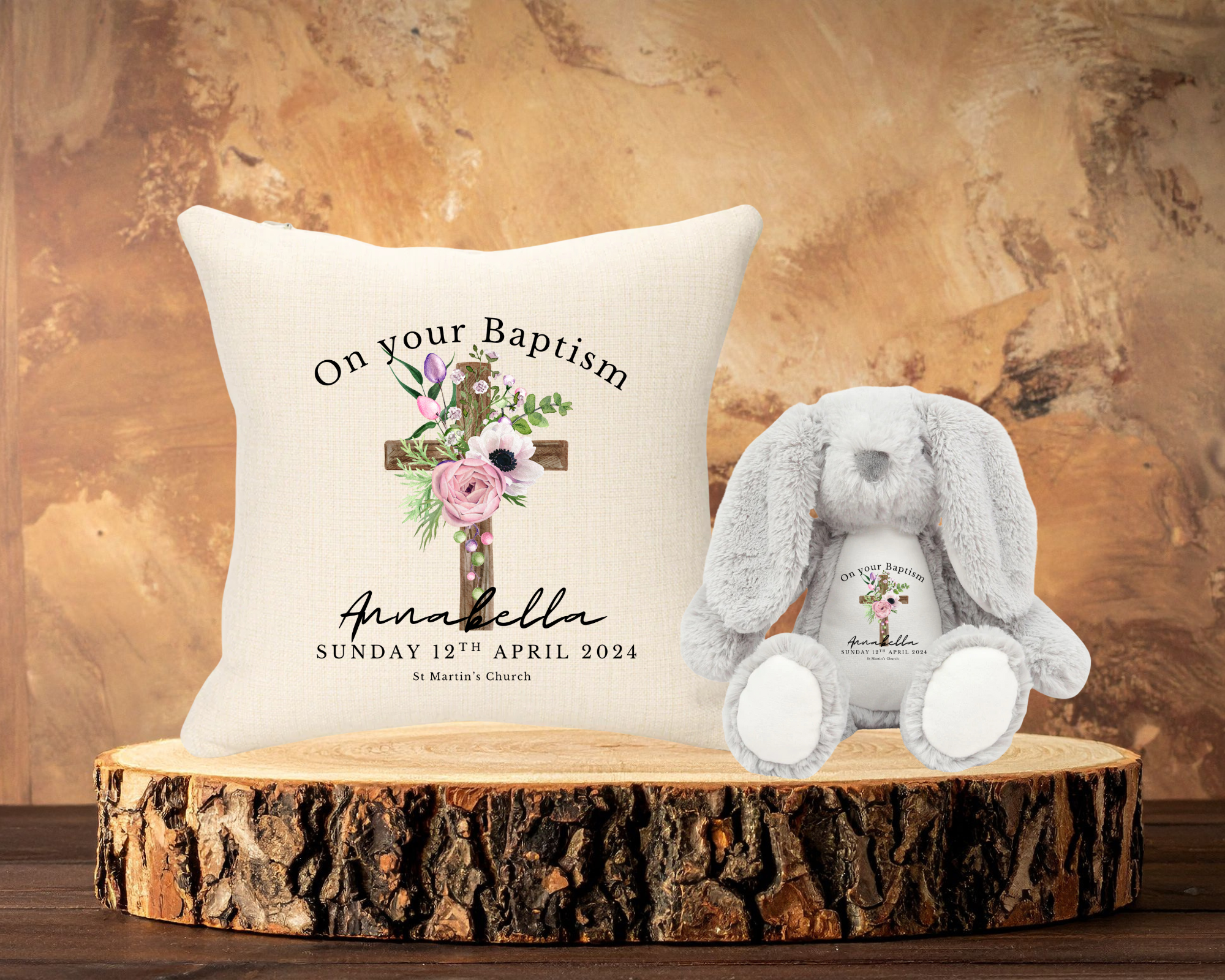 Christening/Baptism Personalised Cushion 40x40cm Linen Cushion & Teddy Bear