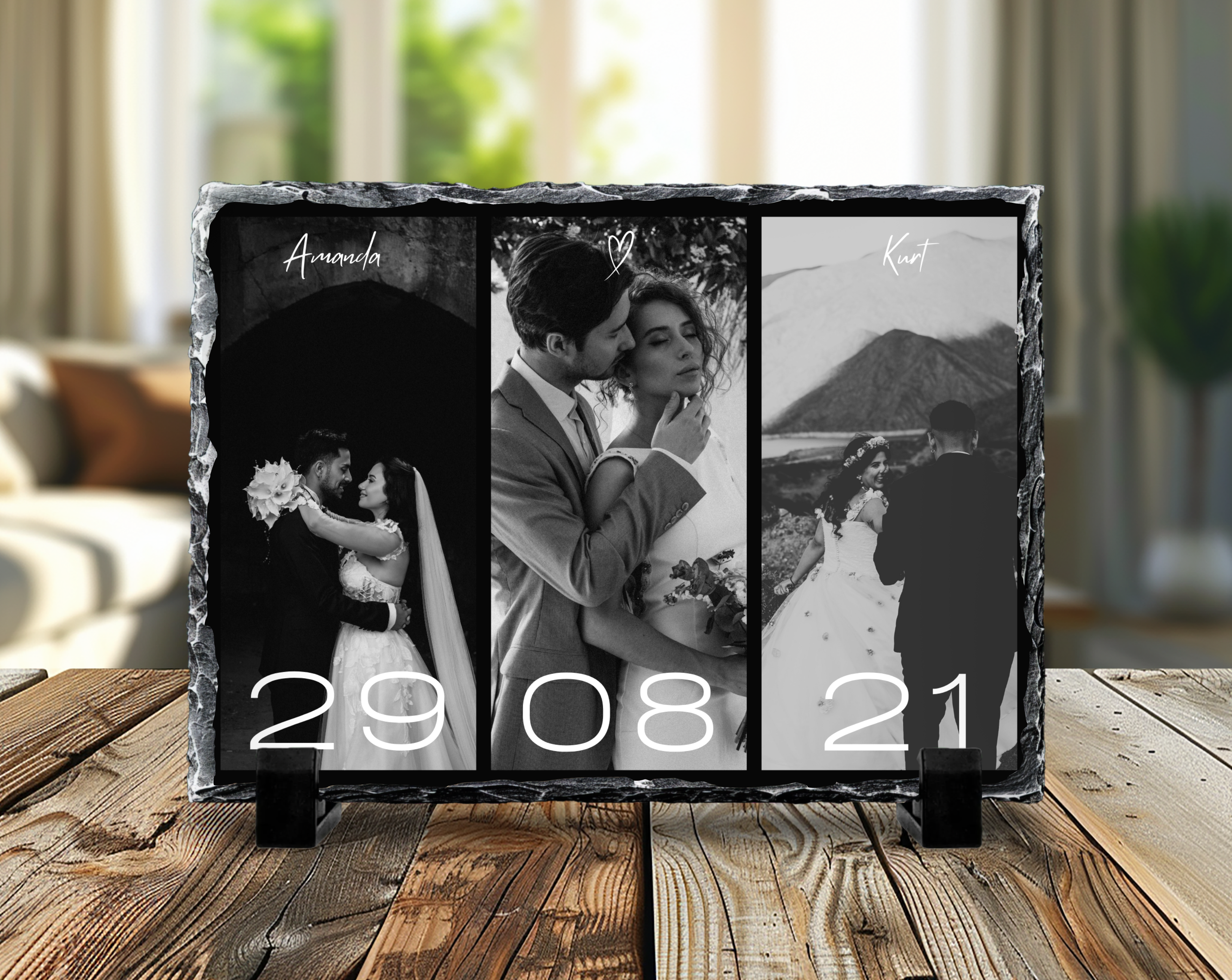 Personalised 3 Image Photo Slate, Love, Names and Dates, Black and White Version