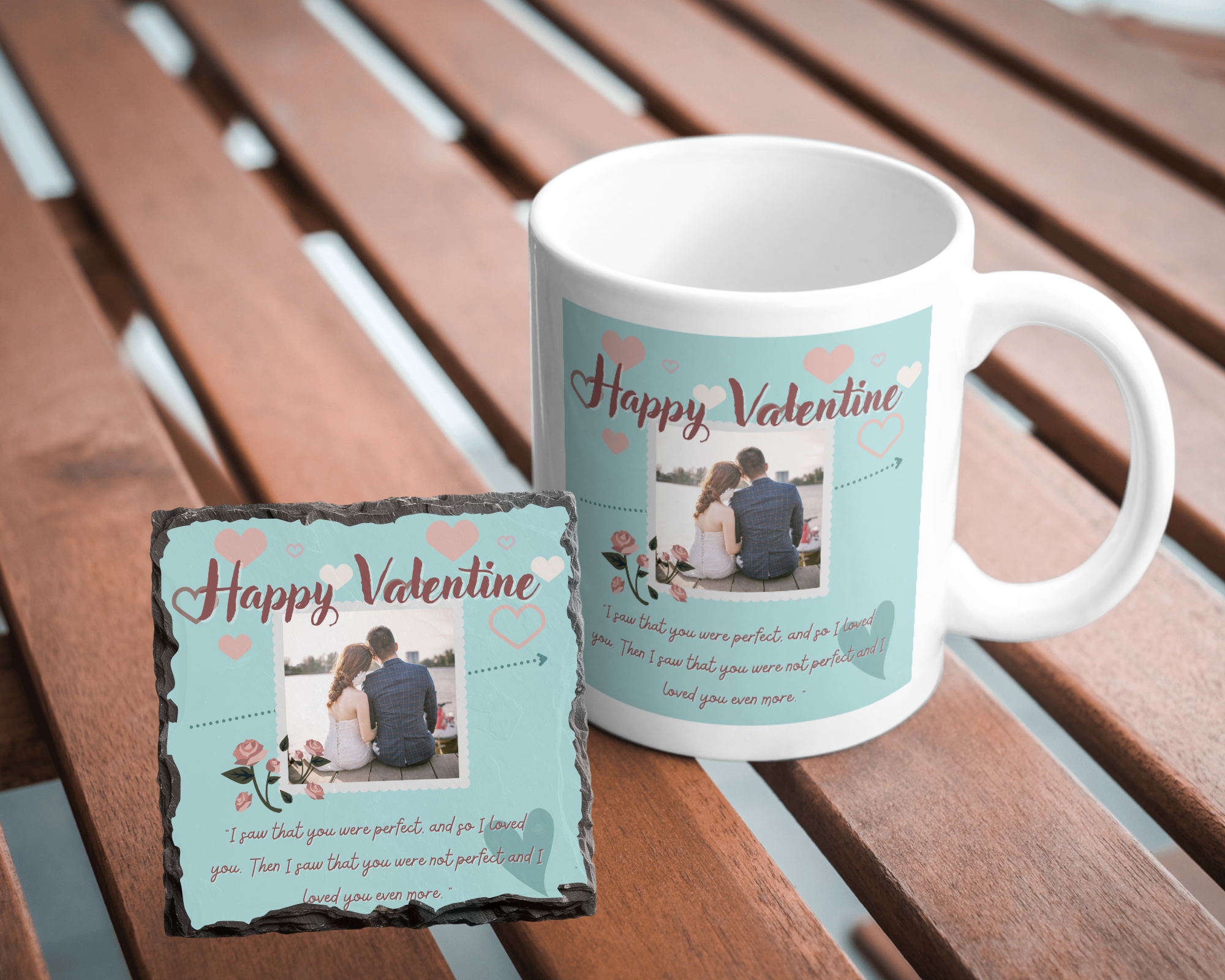 Enhance your Valentine's Day with our 11oz ceramic mug and 9cm Rock Slate Coaster featuring your own personalized photos and... Read more