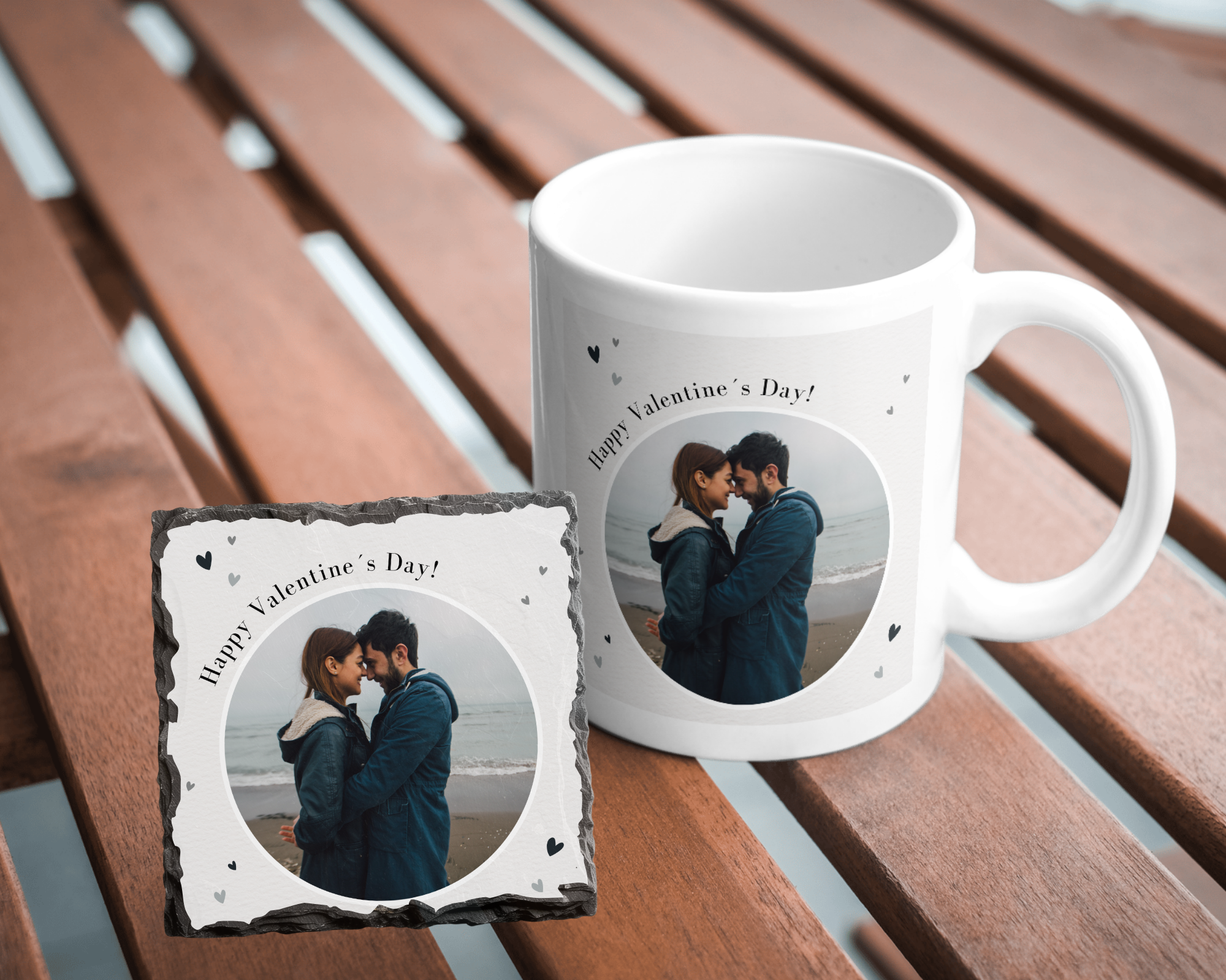 Enhance your Valentine's Day with our 11oz ceramic mug and 9cm Rock Slate Coaster featuring your own personalized photos and text. Select your images and add a special message for a unique and heartfelt gift. Upload using the tool and personalize with ease. Brighten your loved one's day with this thoughtful and sentimental gift.