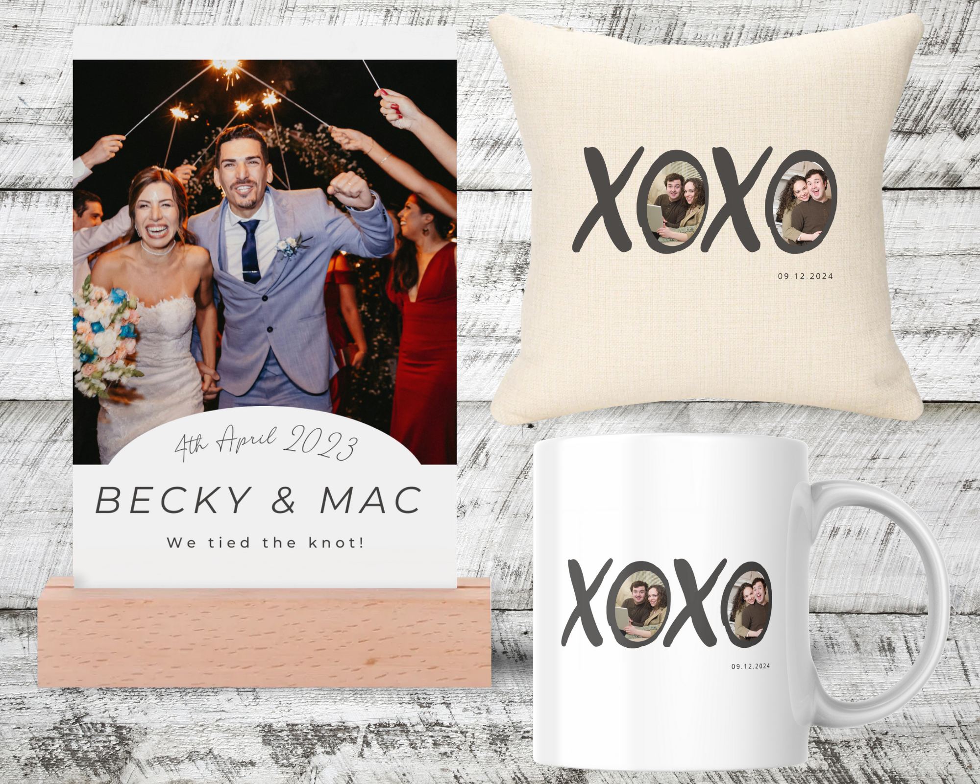 Personalised LED Photo Light measuring 14x21.5cm, 40x40cm linen cushion and 11oz Ceramic Mug